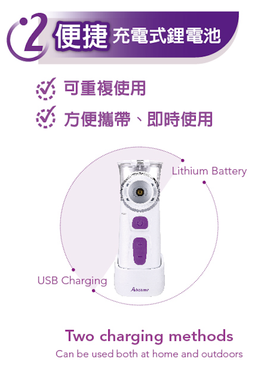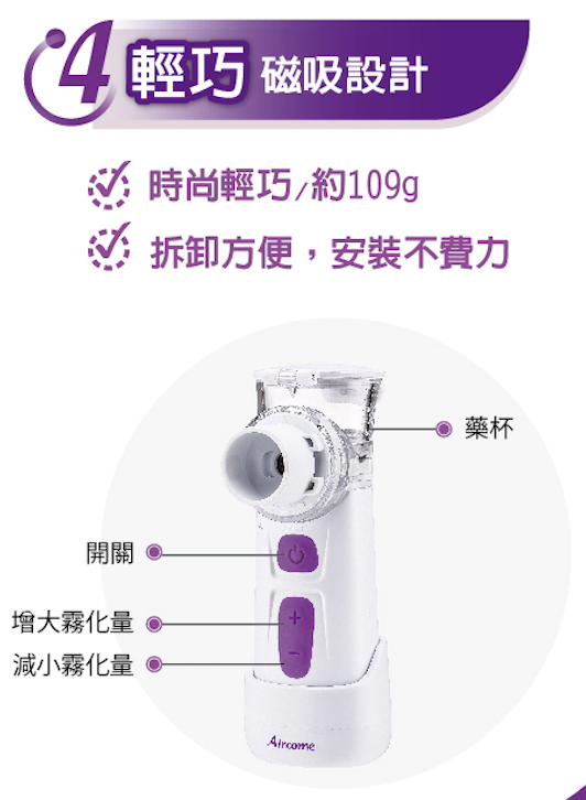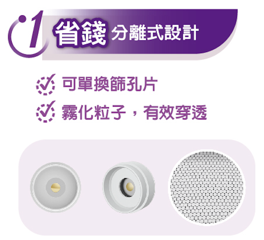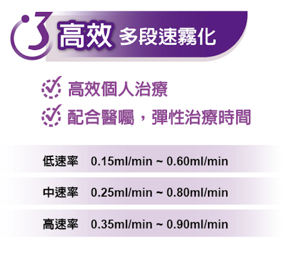 應用範圍:將液體霧化成氣霧分子,傳送到使用者的呼吸道,作為呼吸治療之目的。