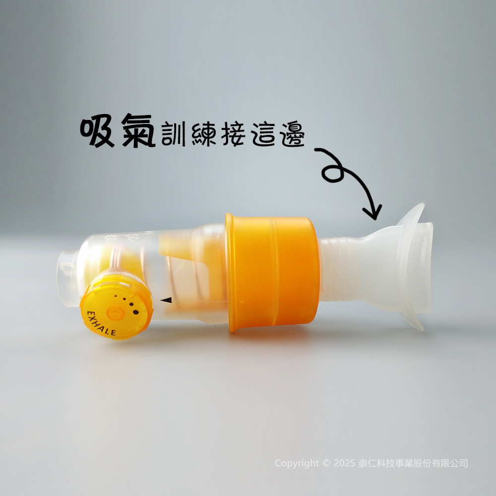 - [吸氣肌訓練]:先將阻力調到適合自己的強度,將嘴巴對好咬嘴後將嘴巴放置於呼吸肌訓練器吸器端,慢慢吐氣,將肺部的氣體慢慢吐乾淨後捏住鼻子,用力吸氣。