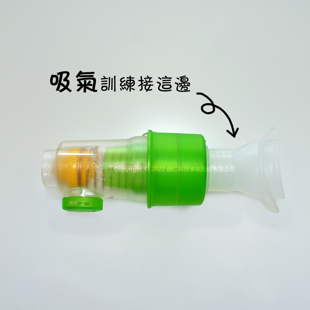 - [吸氣肌訓練]:先將阻力調到適合自己的強度,將嘴巴對好咬嘴後將嘴巴放置於呼吸肌訓練器吸器端,慢慢吐氣,將肺部的氣體慢慢吐乾淨後捏住鼻子,用力吸氣。