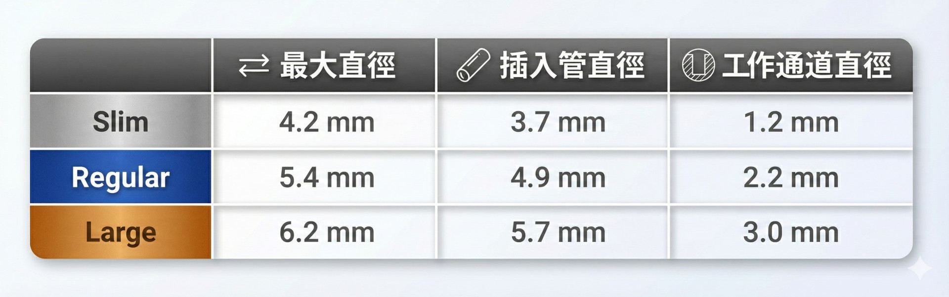 • Large (大徑): 具備 3.0mm 大工作通道,提供卓越的抽吸效能與處置空間。